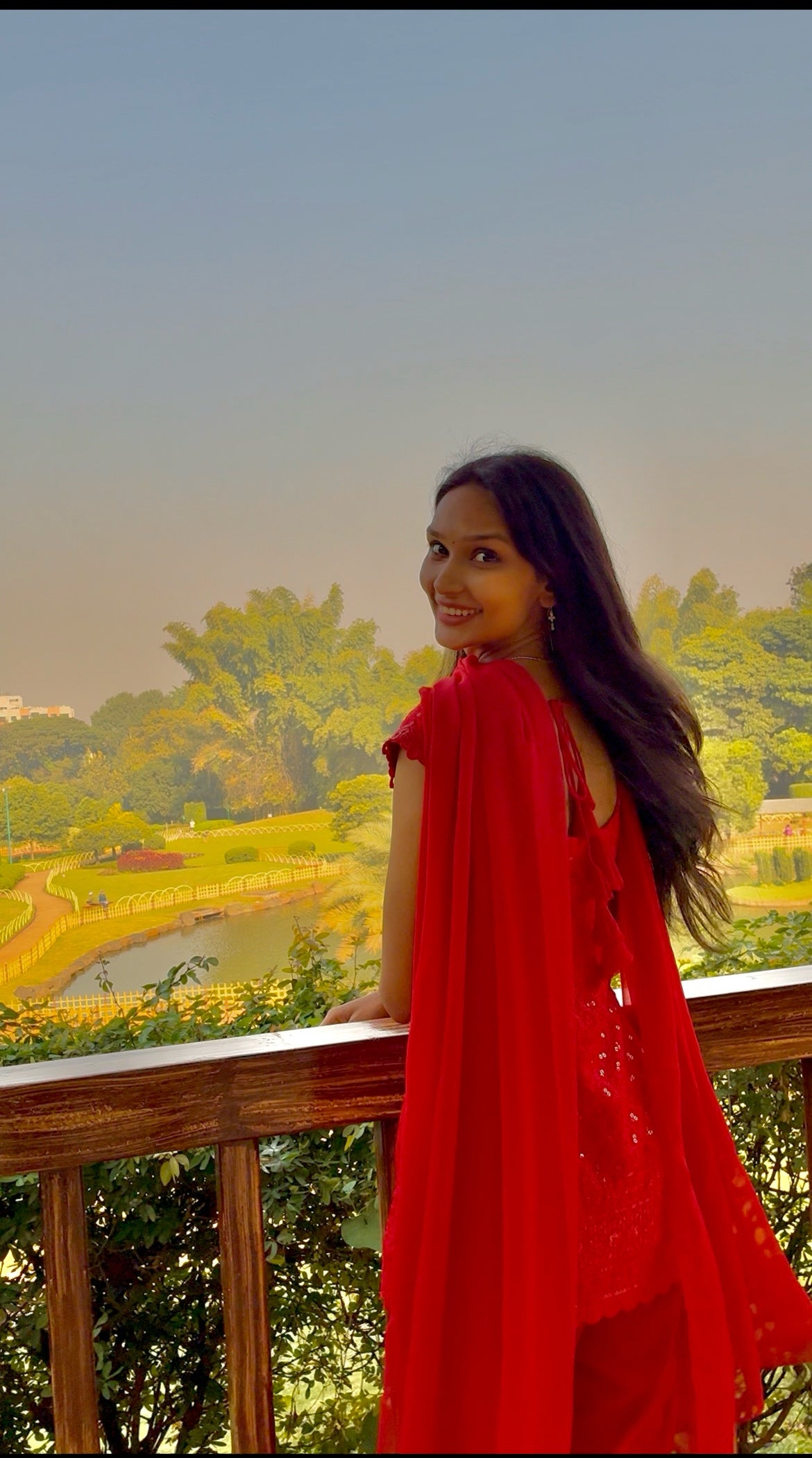 The rich red colour, the flare, the elegance… everything about this outfit screams “all eyes on her.”